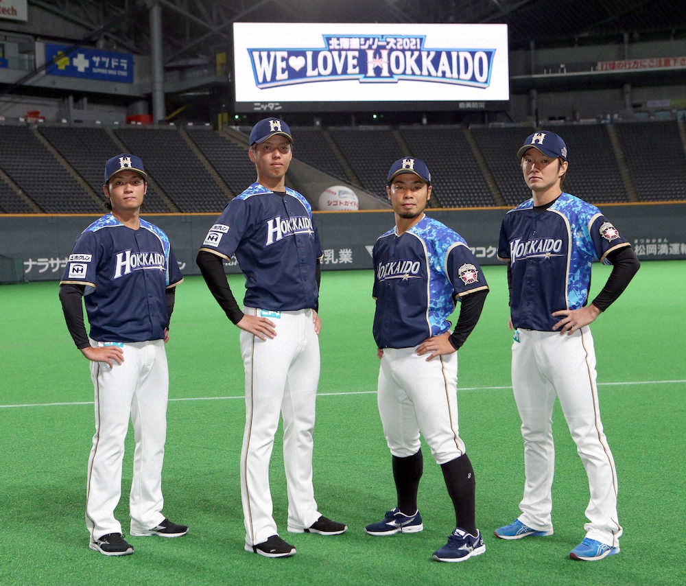 ユニホーム発表では近藤選手会長と、杉浦、玉井、ドラフト1位新人・伊藤(苫小牧駒大)の北海道出身3選手がモデル役を務めた。鹿部町の漁業を営む家に生まれ、海が名前の「大海」の由来でもある伊藤は「おっ、海で来たかと思った」と笑顔になり、「ここでしっかり投げられるように準備をしっかりやっていきたい」と意気込んだ。佐呂間町出身の玉井は「僕の地元も漁業が盛ん。親近感が湧くユニホーム」と話した。
