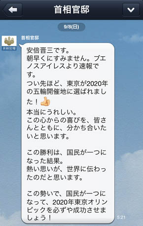 「安倍晋三です。朝早くにすみません。ブエノスアイレスより速報です」――昨年9月8日午前5時過ぎ、首相官邸のLINEアカウントを通じて東京五輪決定の報が届けられた。現在「友だち」数320万人を超える同アカウントは速報性のある新たなメディアとして政府広報の重要な一角になりつつある。政府の情報発信におけるインターネットやSNSに対する姿勢について、内閣官房の担当者に聞いた。- 25 : 2021/03/19(金) 22:14:12.71 ID:a5HKDThz0