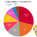 調査結果は以下の通り。まず、「現在どの携帯キャリアをご利用ですか?」と聞くと、「docomo」(29%)、「au」(20%)、「SoftBank」(14%)、「Y!mobile」(10%)、「その他」(10%)、「楽天モバイル」(9%)、「UQ mobile」「mineo」(4%)となった。