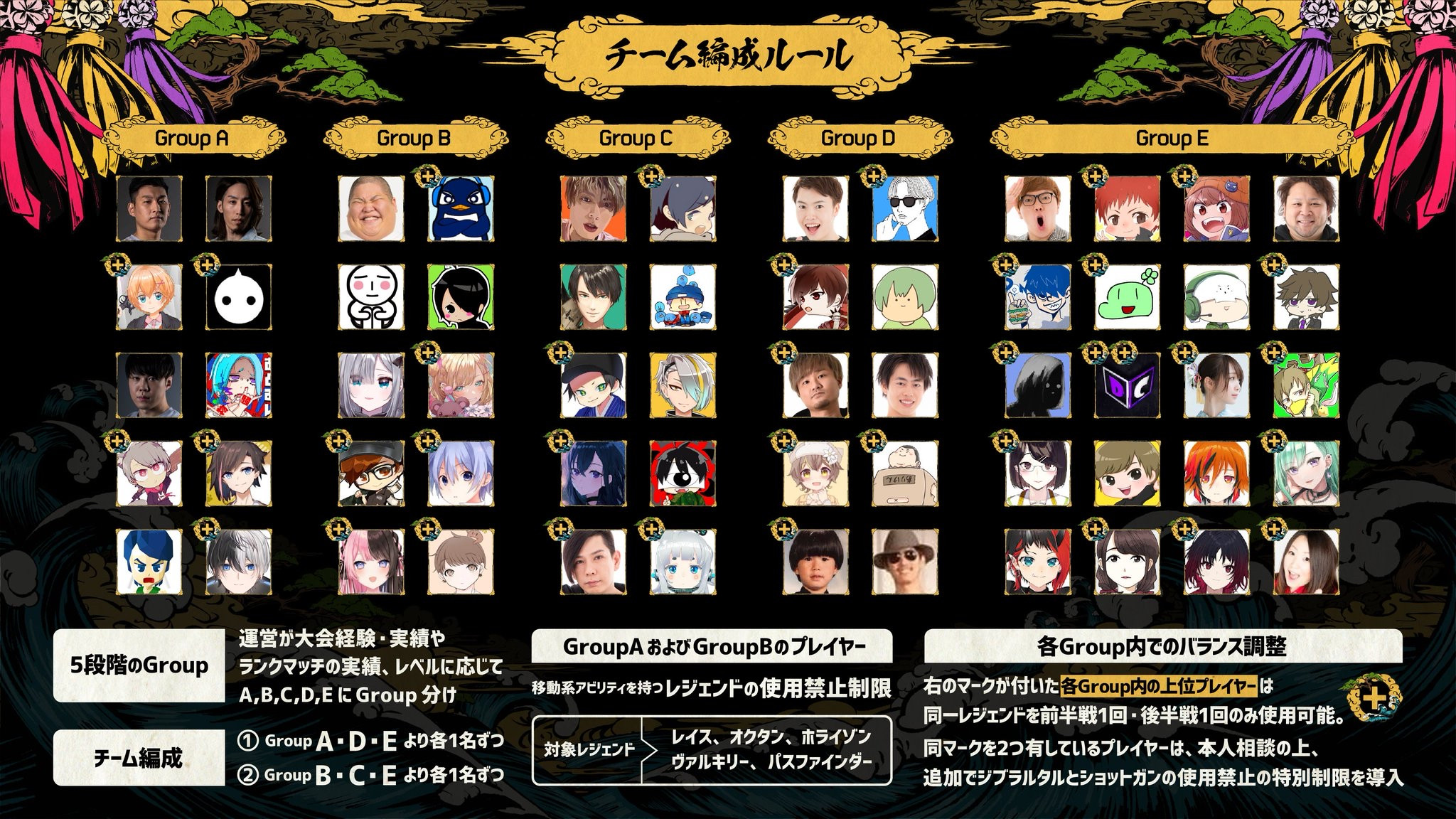 運営が招待選手を実力・実績に応じ5段階のGroup(実力上位からGroupA、B、C、D、Eと呼ぶ)に分け、以下のいずれかの編成になるように、ドラフトでチーム編成。