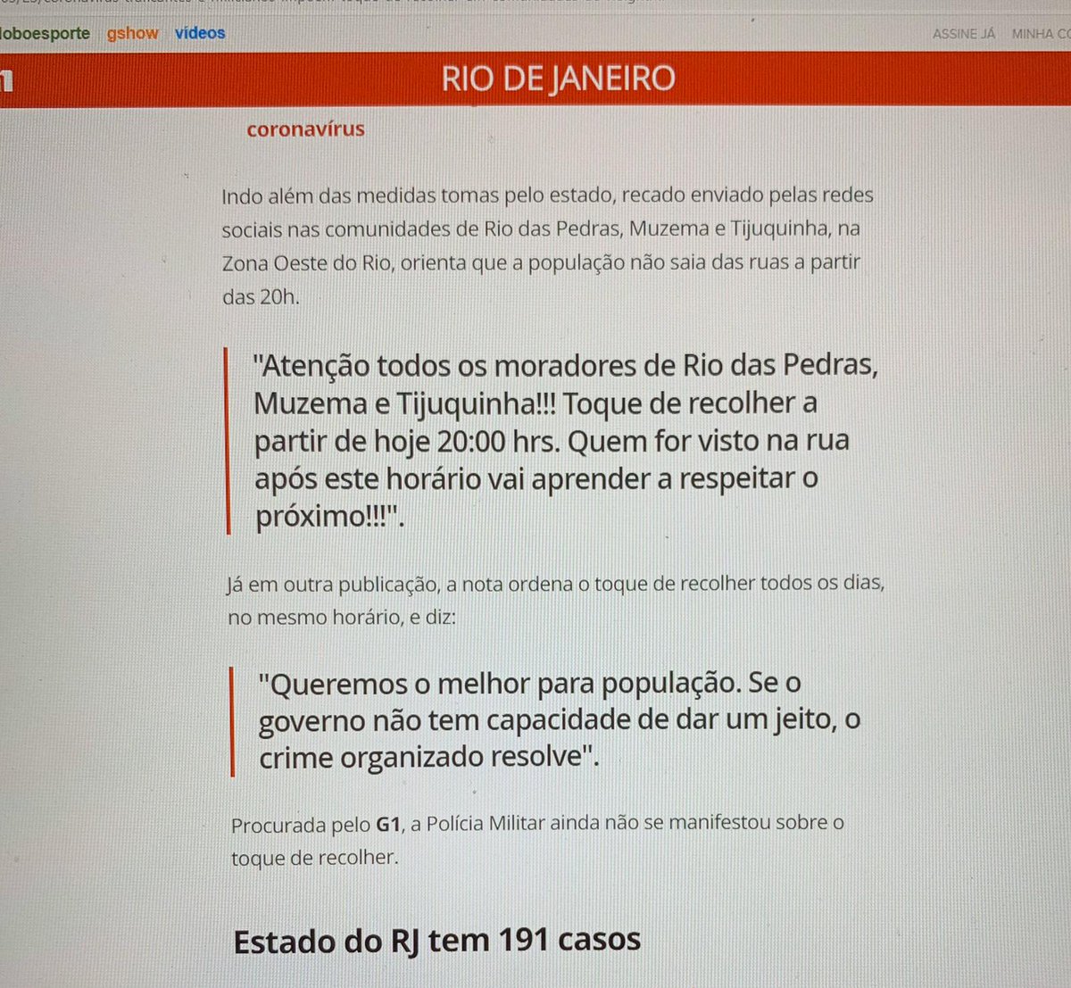 https://twitter.com/andrewcesare/status/1242174265547468803?s=21Gangs in the Rio de Janeiro favelas have enforced a lockdown from 8pm tonight. The statement reads: "If the government won't do the right thing, organised crime will"