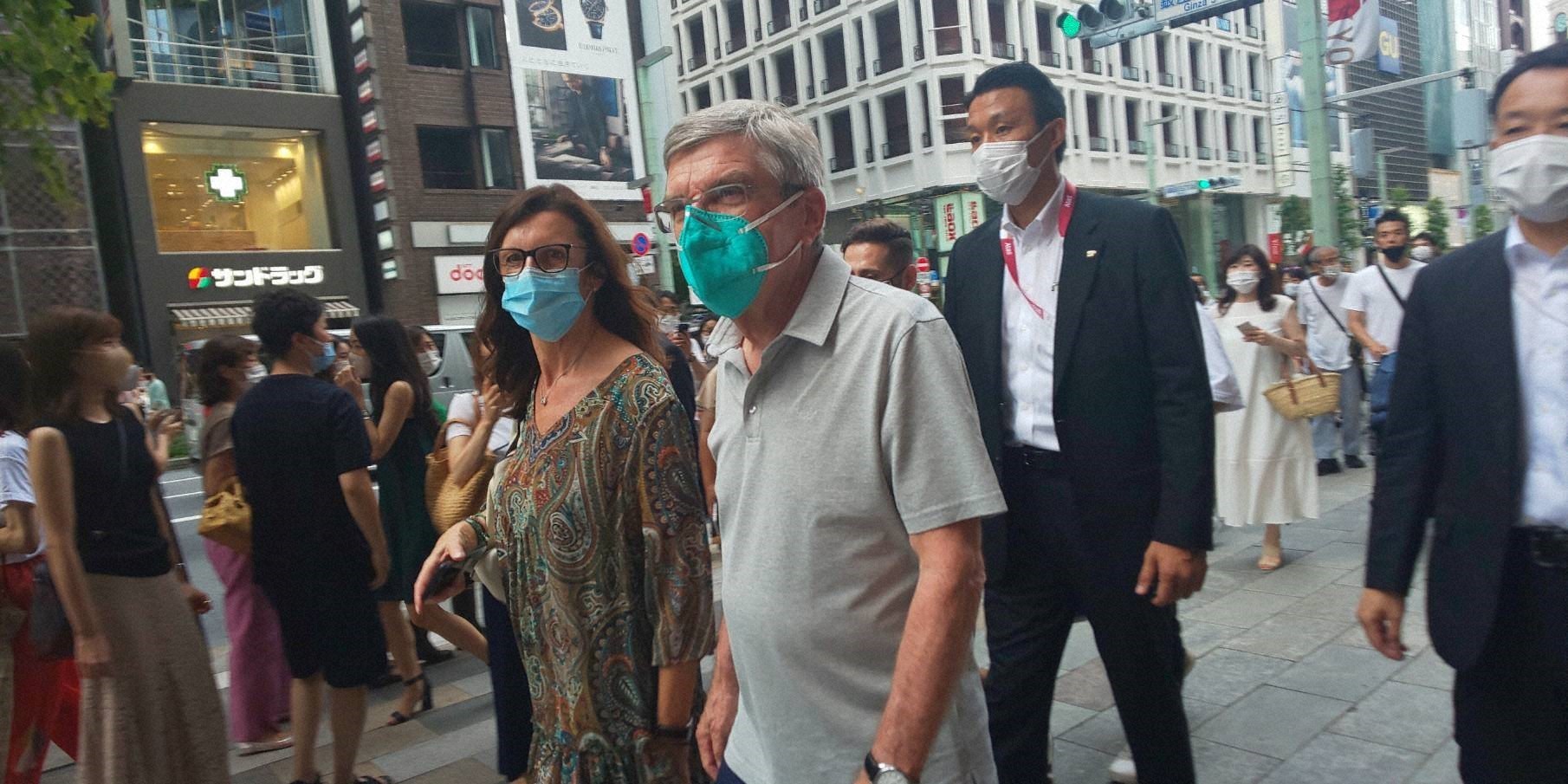 目撃した40代の女性によると、ポロシャツ姿のバッハ会長は午後4時過ぎ、警護がつく中で銀座の中央通りを散策した。