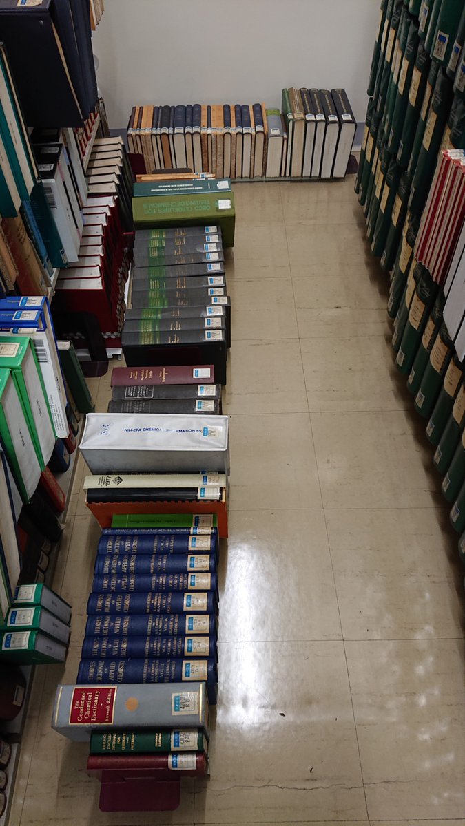 近畿大学中央図書館は、収容力が限界に達しており、写真のように図書を床に並べています。