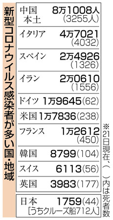 【ベルリン=近藤晶】新型コロナウイルスの感染が拡大する中、ドイツの致死率が低水準にとどまっている。二十一日時点の感染者は二万人近くに達したが、死者は六十二人。致死率は0・3%でイタリアの8・5%、中国の4・0%に比べてかなり低い。一日最高三万件のウイルス検査が可能な医療態勢などが背景にあるとみられるが、十八日以降、感染者、死者とも急増している。