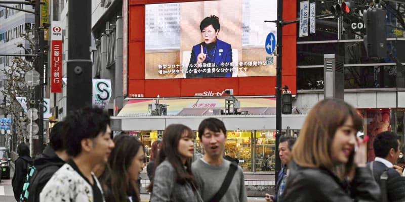 新型コロナウイルスの感染拡大防止を呼び掛ける小池百合子都知事の映像=28日午後