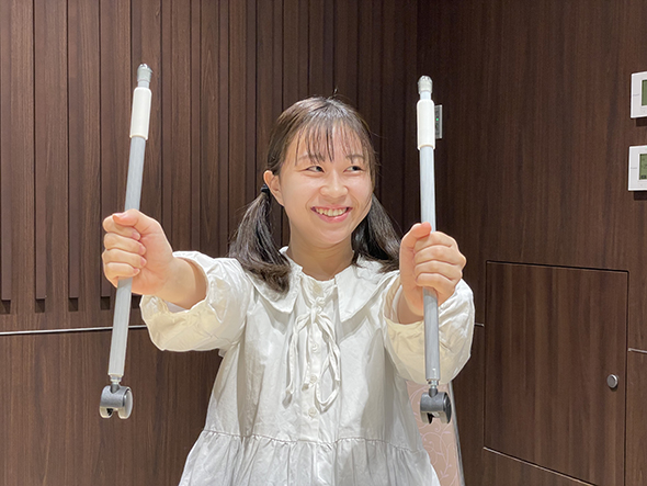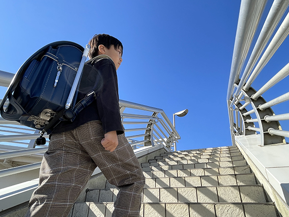 スティック部分は収縮させられるため付けたまま背負うことも可能で、歩道橋や階段を歩く場合は通常のランドセルとして背負えるようにした。