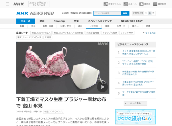 【ブラジャーマスク】下着工場でマスク生産 ブラジャー素材の布で 富山 氷見