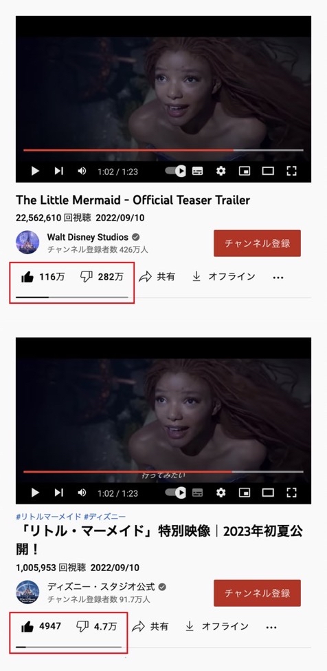 ディズニー映画『リトル・マーメイド』実写版の主役アリエルに黒人歌手のハリー・ベイリーが起用されたことが議論を呼び、予告篇には低評価が殺到しているという。確認してみると、英語圏では低評価が7割やった。日本人として気になったのが、日本では低評価が9割で、コメント欄が閉鎖されとること。
