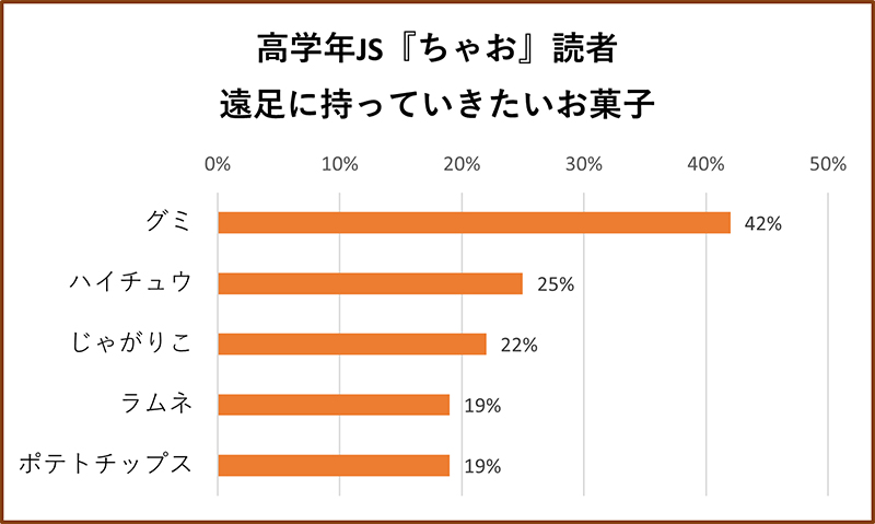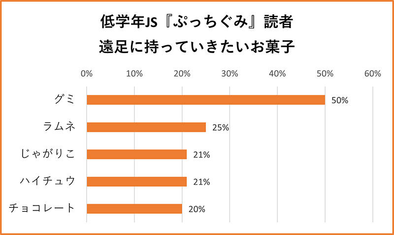 小学館が発行する小学校低学年女児向け情報誌『ぷっちぐみ』と、少女まんが誌『ちゃお』が「遠足・校外学習」に関するアンケート調査を実施した。今年は遠足や校外学習があるかと質問すると『ぷっちぐみ』読者の59%、『ちゃお』読者の79%が「ある」と回答した。遠足に持っていきたいお菓子について聞いたところ、『ぷっちぐみ』『ちゃお』読者ともに1位は「グミ」(50%、42%)だった。