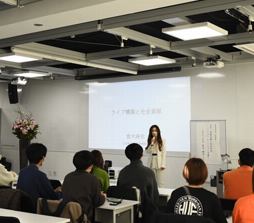 学生時代、音楽活動と並行しながら立命館大学で学んだ倉木は、2016年より立命館大学産業社会学部客員准教授(※現在は客員教授)として招聘され、これまでにも特別講義を行ってきた。コロナ禍を経て約4年ぶりの講義となった今回は「ライブ構築と社会貢献」をテーマに、2021年に行った配信ライブ、そして、これまでに行ってきたチャリティーライブや楽曲・グッズの企画を例に挙げながら、文化・音楽活動と社会形成の関連性について自身の経験を元に語った。