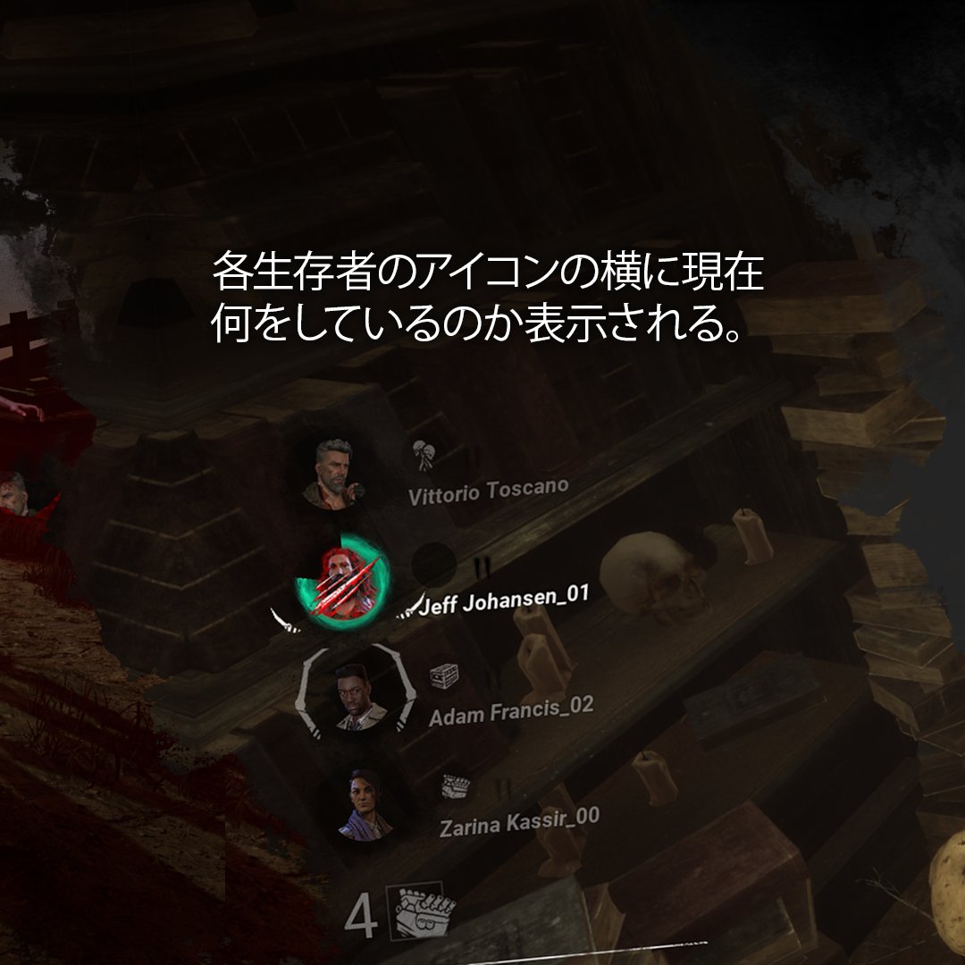 ②殺人鬼に追われている生存者が殺人鬼と生存者全員に表示される機能