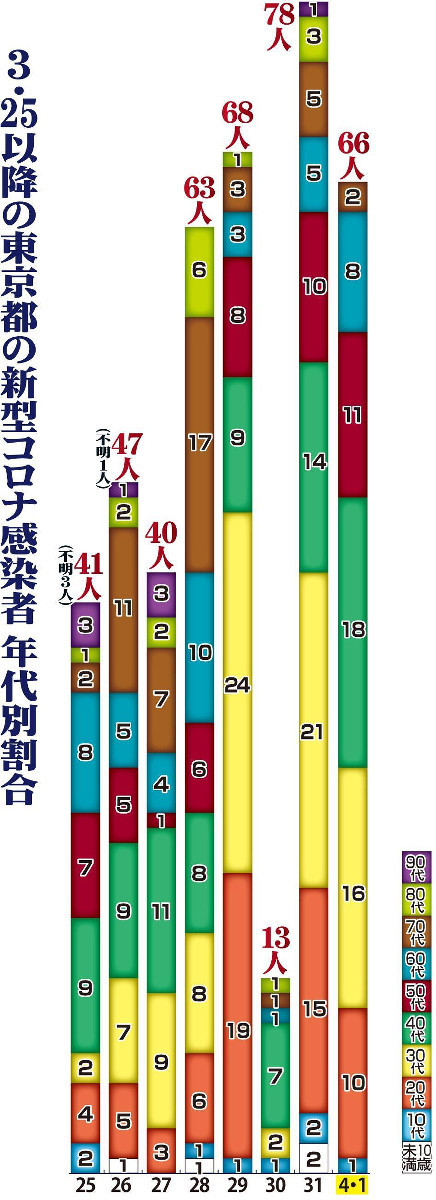 【東京都】新たに66人感染 20~40代が44人 感染経路不明は38人 4/1