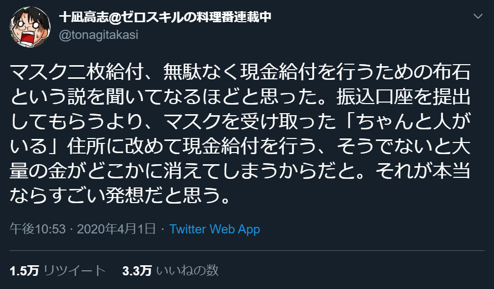 識者「政府がマスク二枚を配るのは本当は住所に住民がいるかどうかを調べるためであり、その後に本当の現金給付が始まる布石」3万いい ね