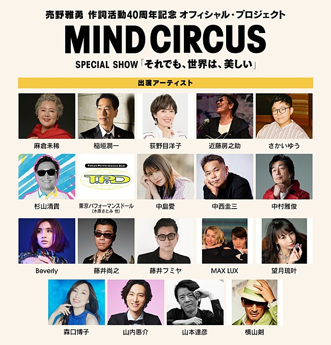 藤井フミヤ、中西圭三、荻野目洋子、杉山清貴などが出演する【売野雅勇 作詞活動40周年記念 オフィシャル・プロジェクト MIND CIRCUS SPECIAL SHOW「それでも、世界は、美しい」】が、7月15日に東京国際フォーラムで開催されることが、決定した。
