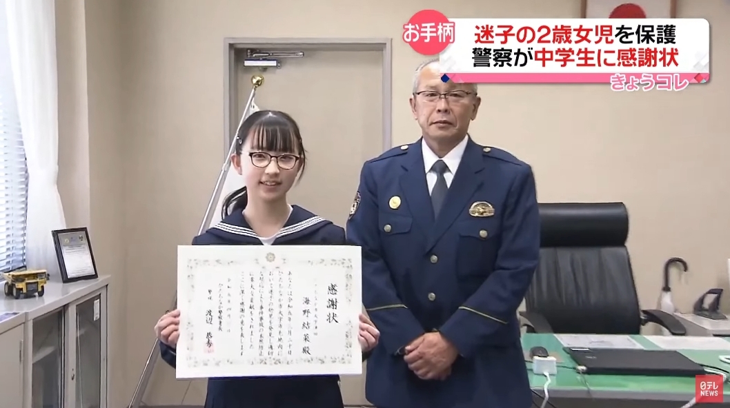 当時、中学2年生だった海野さんは先月20日、学校から帰宅中に、片側2車線の道路を1人で渡る2歳の女の子を発見。事件や事故を未然に防いだとして、感謝状が贈られたのです。