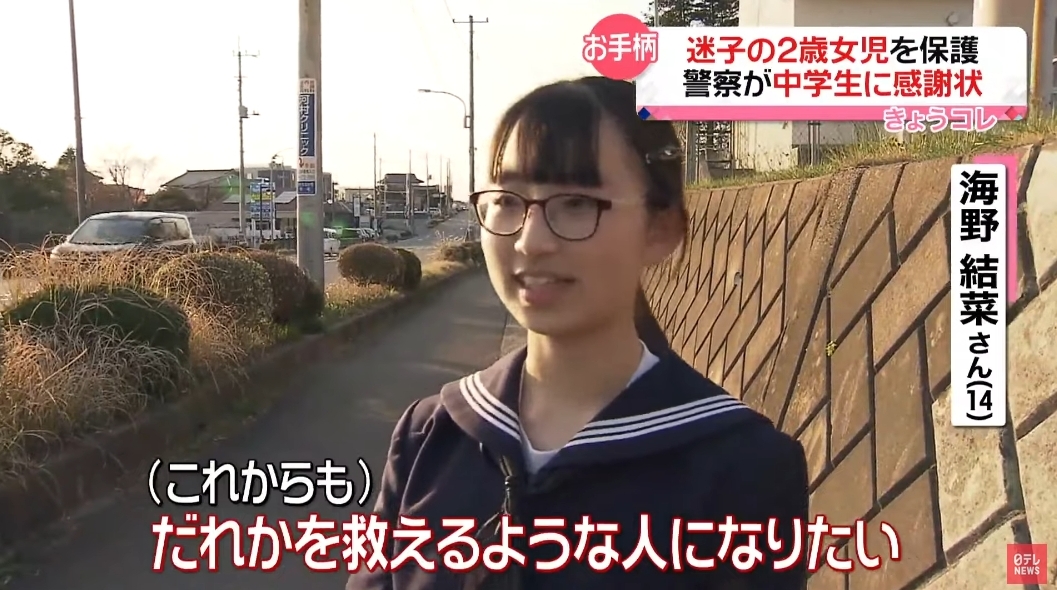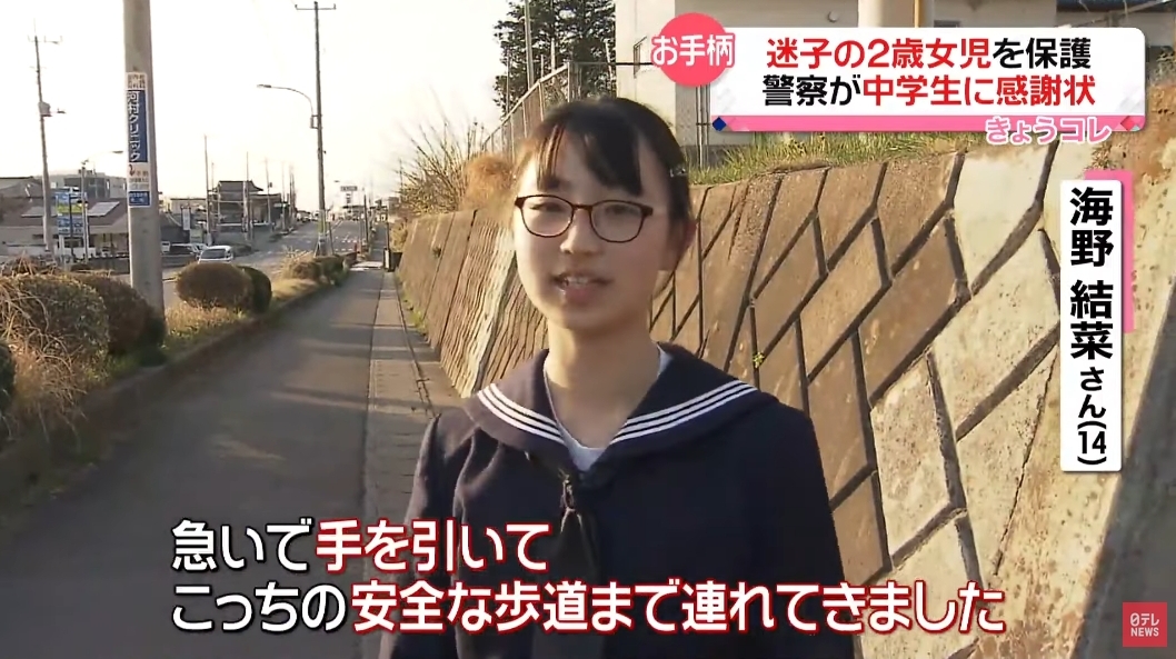 当時、中学2年生だった海野さんは先月20日、学校から帰宅中に、片側2車線の道路を1人で渡る2歳の女の子を発見。事件や事故を未然に防いだとして、感謝状が贈られたのです。