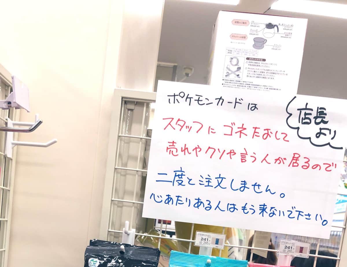 ツイッターで2023年5月下旬、ファミリーマート店内に、ポケカに関して店長が「スタッフにゴネたおして売れやクソや言う人が居るので二度と注文しません」と伝えている張り紙があったと写真で紹介された。張り紙には「心あたりある人はもう来ないで下さい」とも記されている。