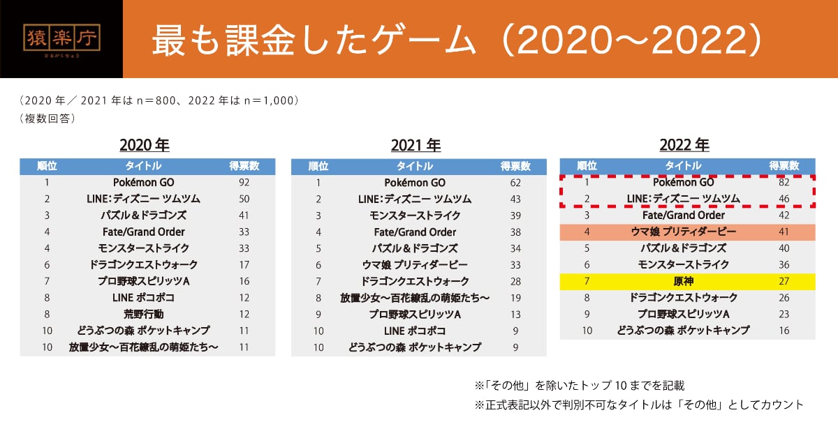 ユーザー調査結果を発表した。「最も課金したゲーム」の1位は「ポケモンGO」(iOS、Android)だった。2022年にモバイルゲームで課金した実績のある10~60代の男女1000人に調査した。これによると「最も課金したゲーム」の