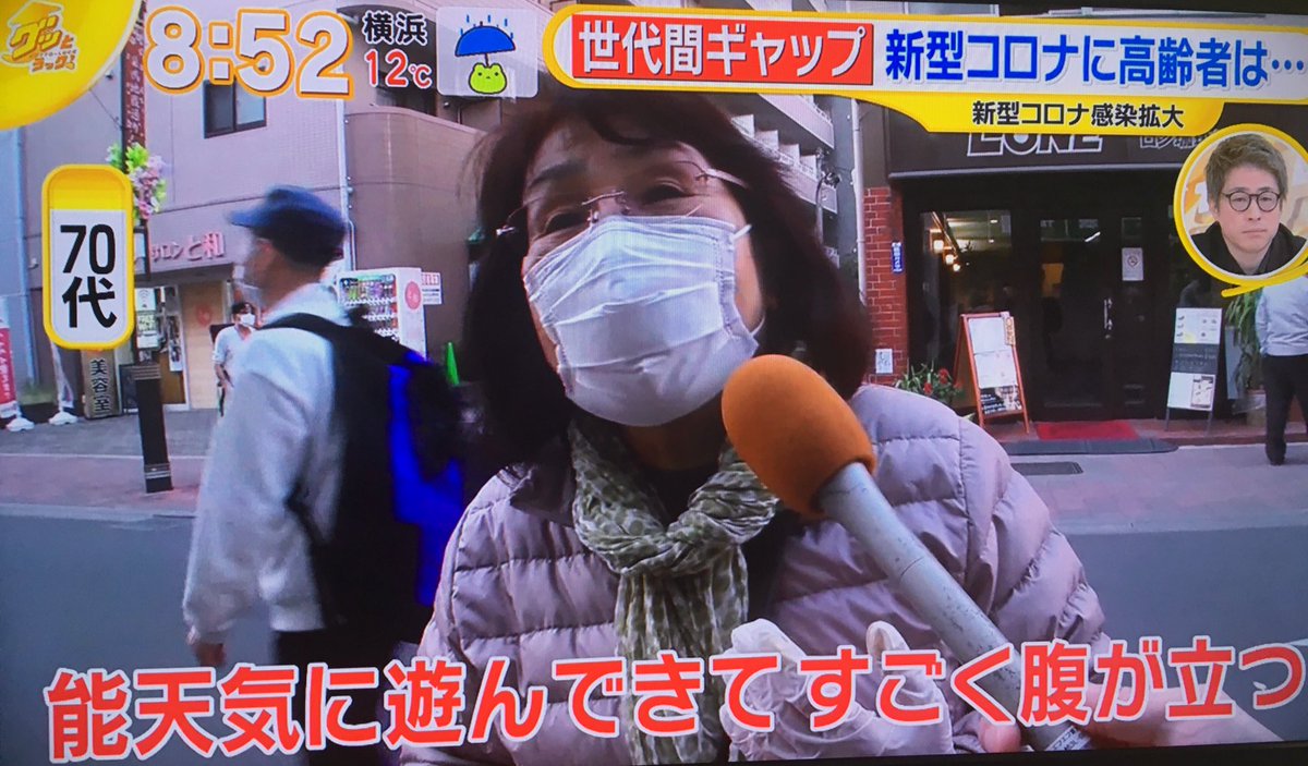- テレビとか芸能人のツイッターとか見てても若者は外出るなと何故か若者限定で注意促してたな