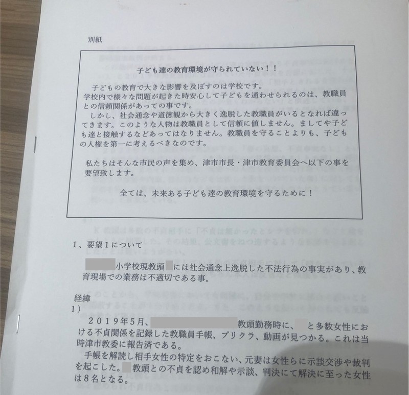 【三重】津市の小学校教頭が16人と不倫か 元妻「私と相手を比べて手帳に点数。泣きました」市民団体が更迭を求める要望書提出