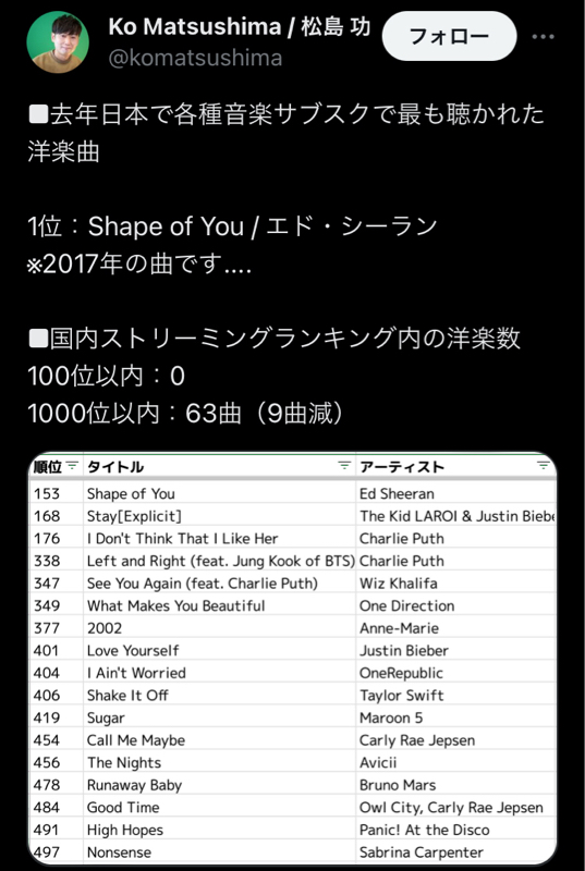 洋楽1位は153位のエドシーランのShape Of You (2017)”Z世代に話題のモデル”那須ほほみ、『思い出たち』とたくさんのショットを公開「可愛すぎる」と反響