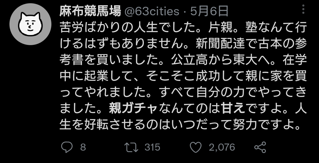 - 親ガチャ成功してたらその努力が少なくて済むんだよ