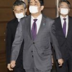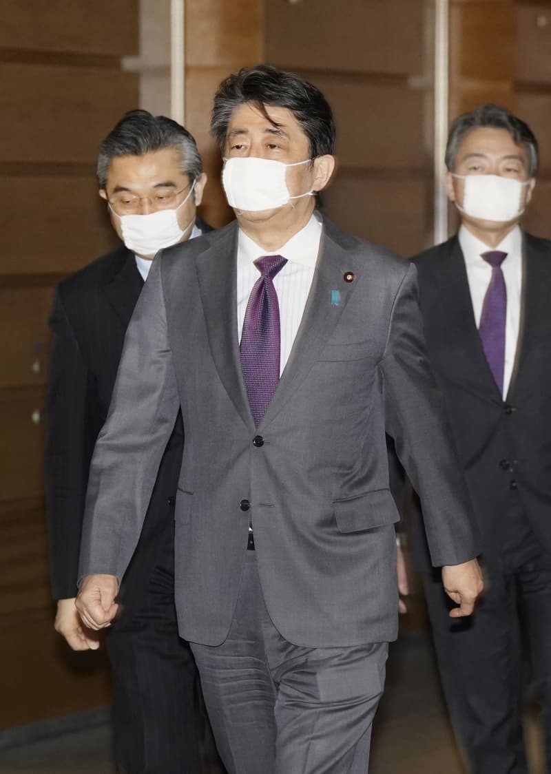 マスクを着用し、首相官邸を出る安倍首相=5日午後