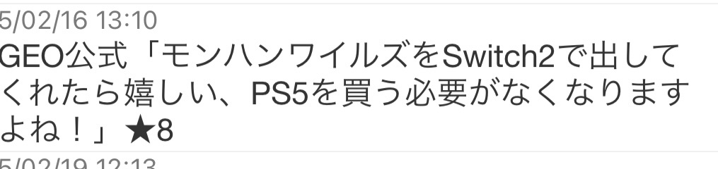 今までの行動パターンから考えるに任天堂自身がモンハンに対抗するように何かしら発表すると思うわ - 20 : 2025/02/20(木) 08:45:52.89 ID:tSHZTFQad
