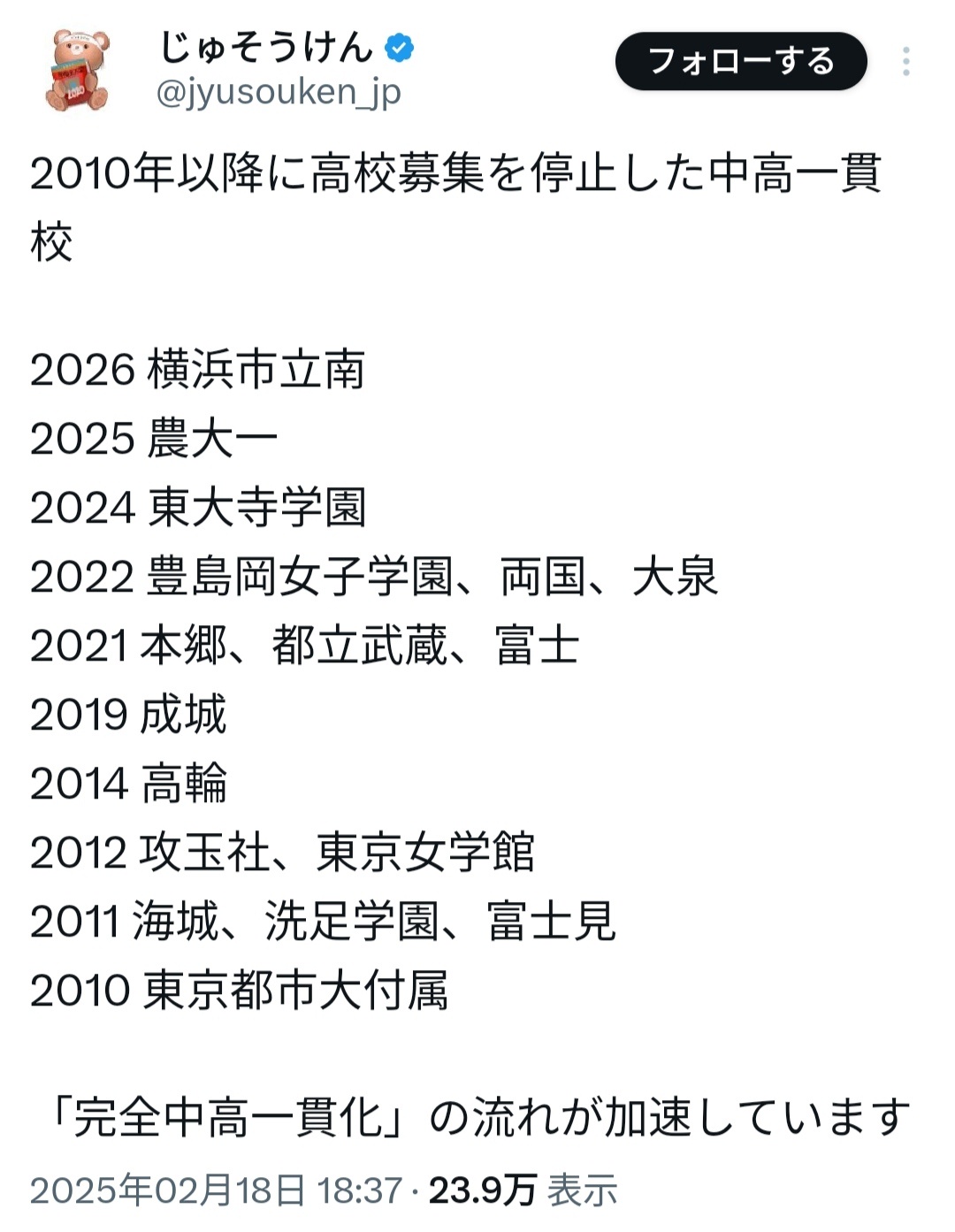地方もどんどん公立進学校が中高一貫校化しとるわ