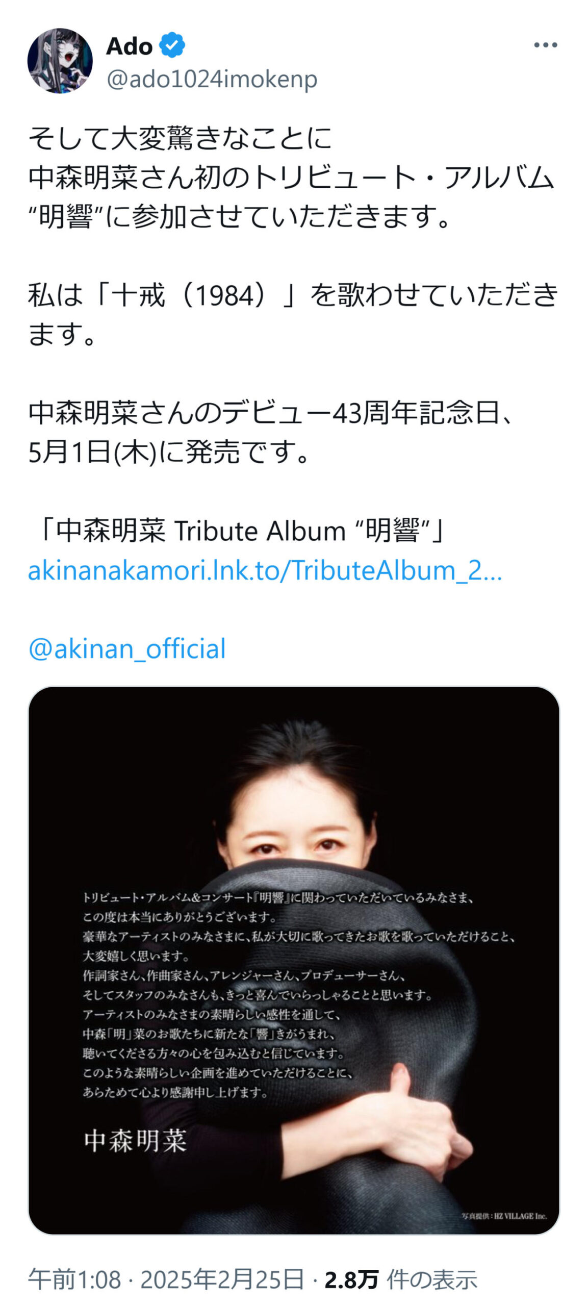 Ado「マジで命終わるかと」X投稿から一転「中森明菜トリビュートアルバム」参加&担当曲発表