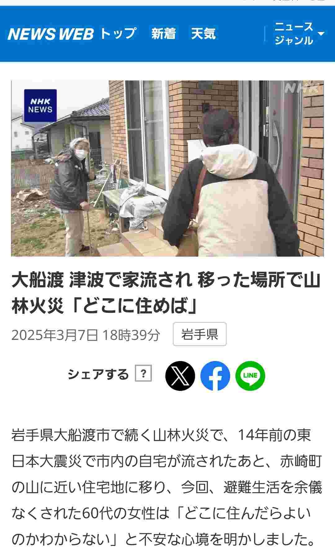 東北民「津波で家流された…山の方に住むか」 →山火事で燃える