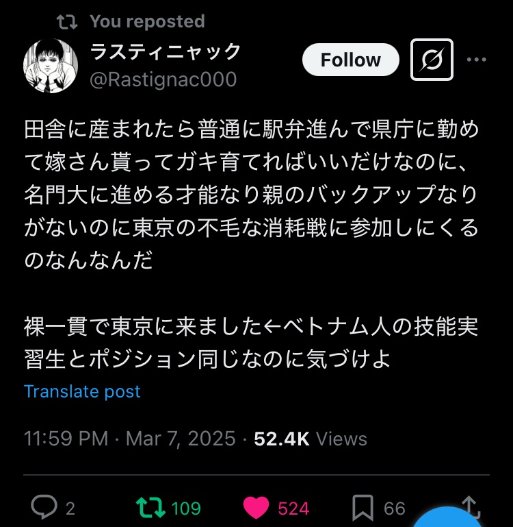 X「学歴無いのに東京来る地方民いるけど、それ、ベトナム人の技能実習生と同じポジションですよ?」