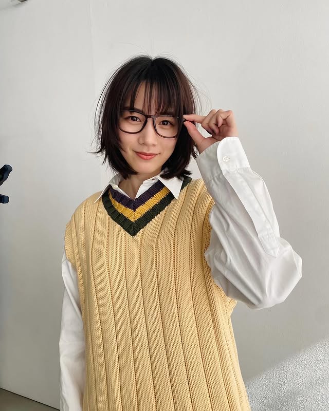 のんが「メガネまで全部古着」と投稿したのは自身のオフショット。写真にはフレームの大きな黒縁メガネに、白シャツ&ニットベスト、黒ボトムス、ローファーという装いが収められている。