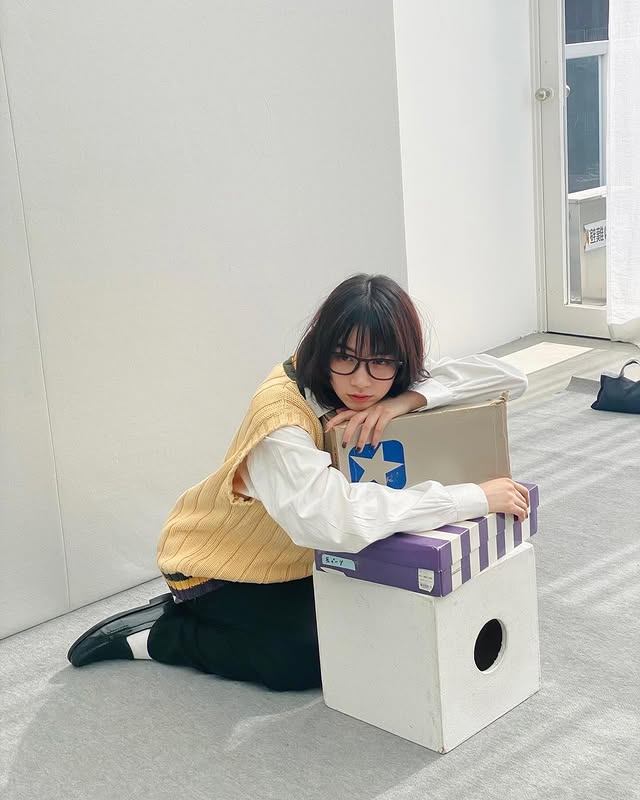 のんが「メガネまで全部古着」と投稿したのは自身のオフショット。写真にはフレームの大きな黒縁メガネに、白シャツ&ニットベスト、黒ボトムス、ローファーという装いが収められている。