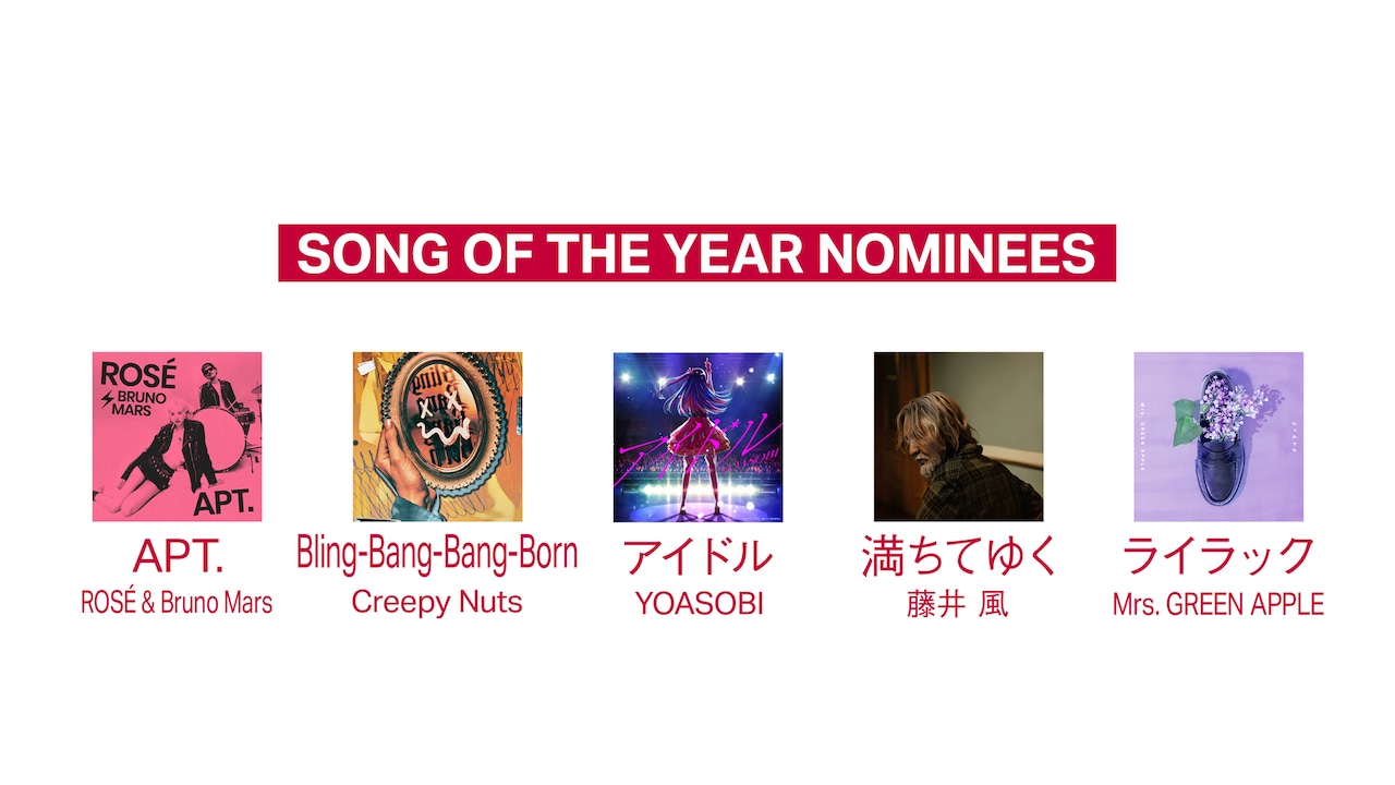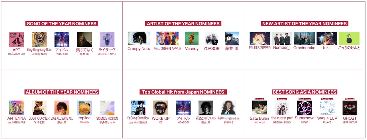 ノミネート作品 / アーティストの数は計251作品 / 65アーティスト。主要6部門の最優秀楽曲賞では256曲、最優秀アーティスト賞では167アーティスト、最優秀アルバム賞では171作品、最優秀ニュー・アーティスト賞では61アーティスト、Top Global Hit from Japanでは100曲、最優秀アジア楽曲賞では24曲のエントリーの中から、各部門5つずつのノミネート作品 / アーティストが選ばれた。このうち最優秀アーティスト賞のノミネートアーティストにはCreepy Nuts、Mrs. GREEN APPLE 、Vaundy、YOASOBI、藤井風の5組がラインナップされている。