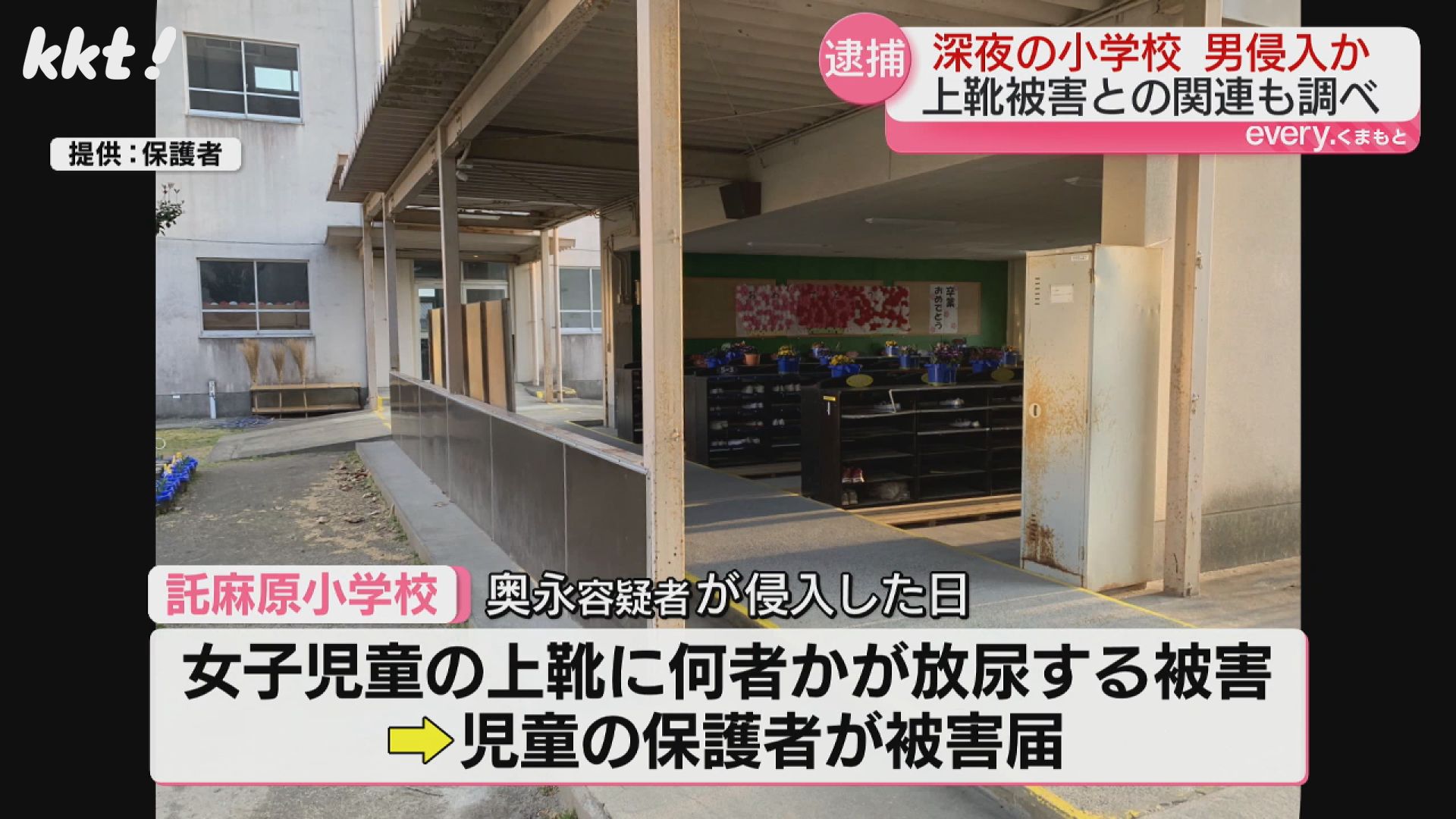 https://news.ntv.co.jp/n/kkt/category/society/kk7d8c36ef9e724af696b364dd90eb4f64託麻原小学校では、奥永容疑者が侵入した日に女子児童の上靴10足ほどに何者かが放尿するなどの被害が発生していて、児童の保護者が被害届を出していました。