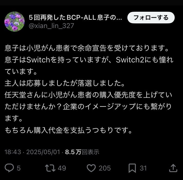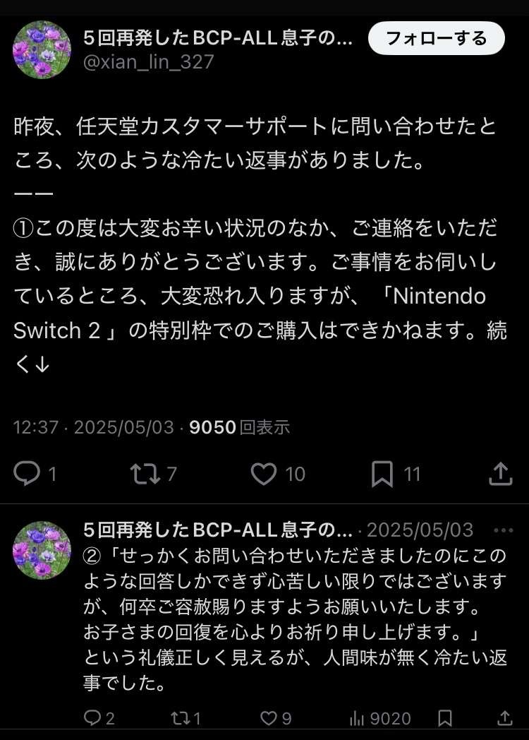 - 「ご厚意で譲って頂いたswitch2で1度も遊ぶことなく昨夜旅立ちました。