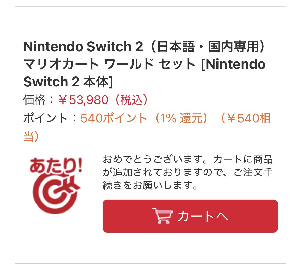 HIKAKINは「震えた…」という一言とともに、Nintendo Switch 2(日本語・国内専用)「マリオカート ワールドセット」の購入権を獲得したことを明かした。表示されている価格は税込5万3980円。
