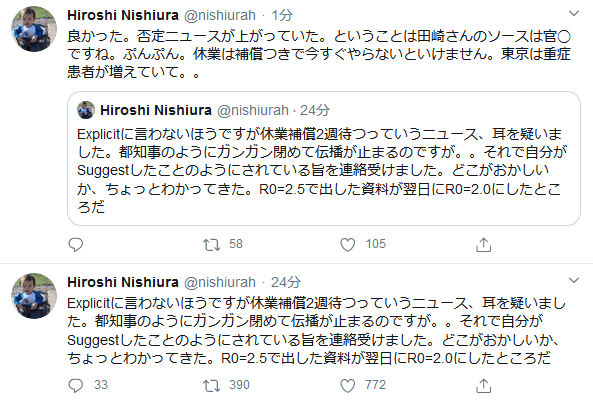 西浦博「なんで俺が休業補償にストップ提案したことになってるんだ」「分かった、再生産係数R=2.5をR=2.0に勝手に修正した奴だ・・・」