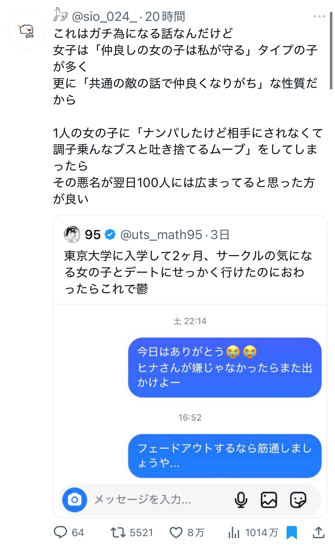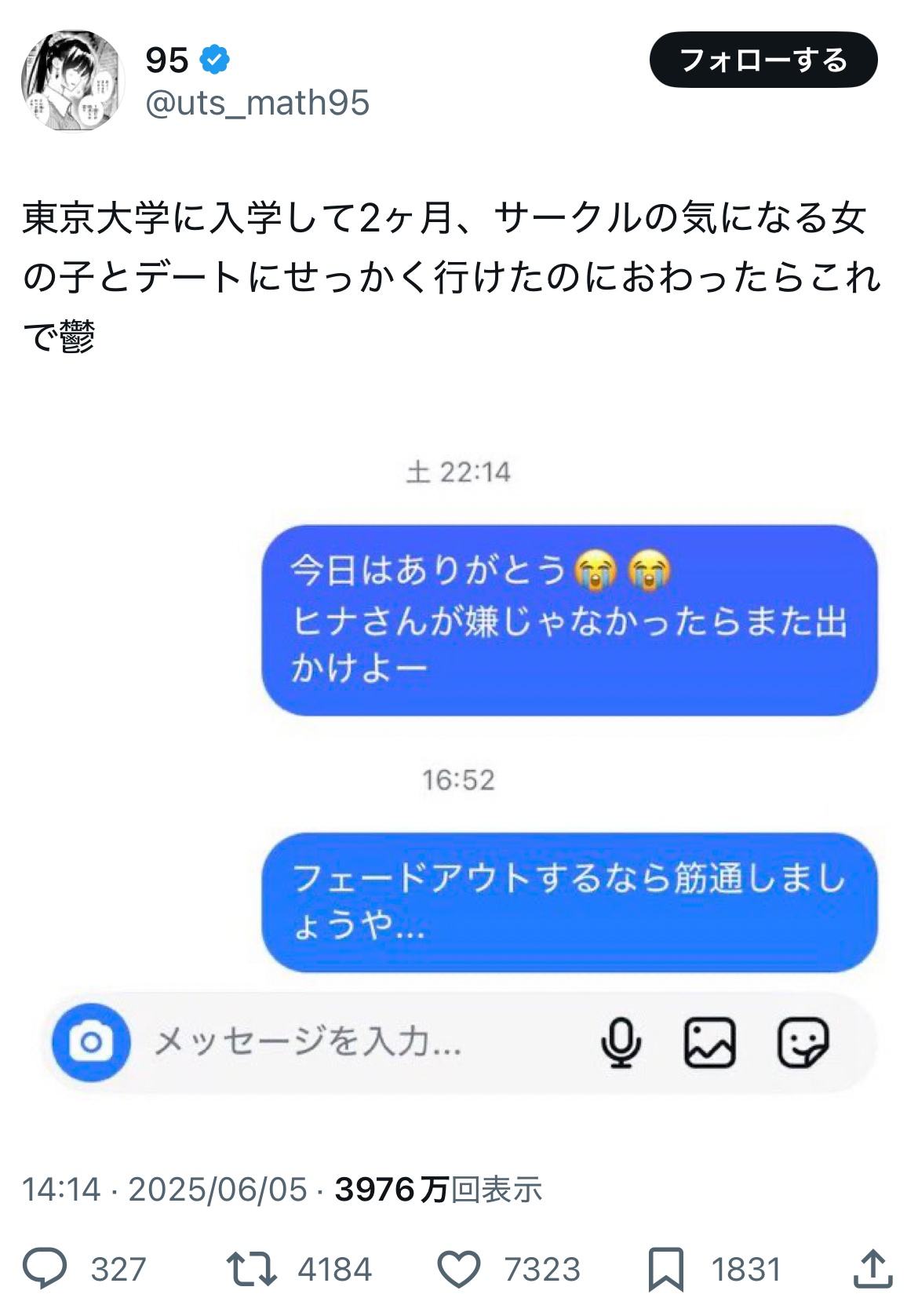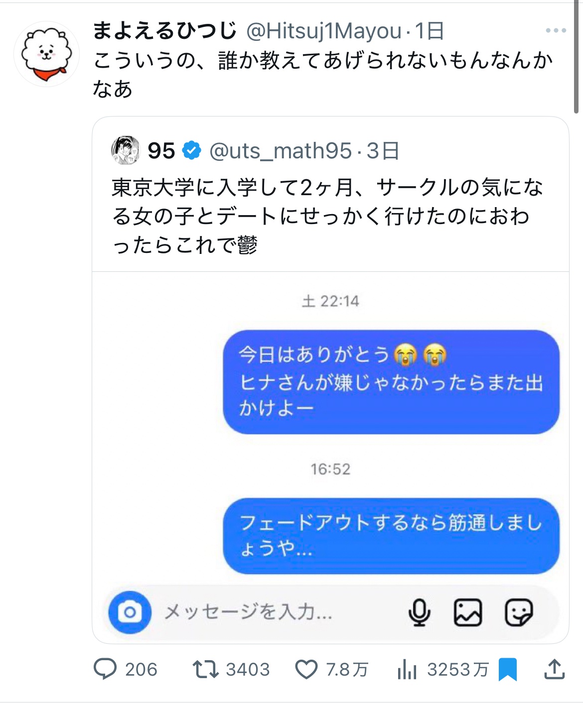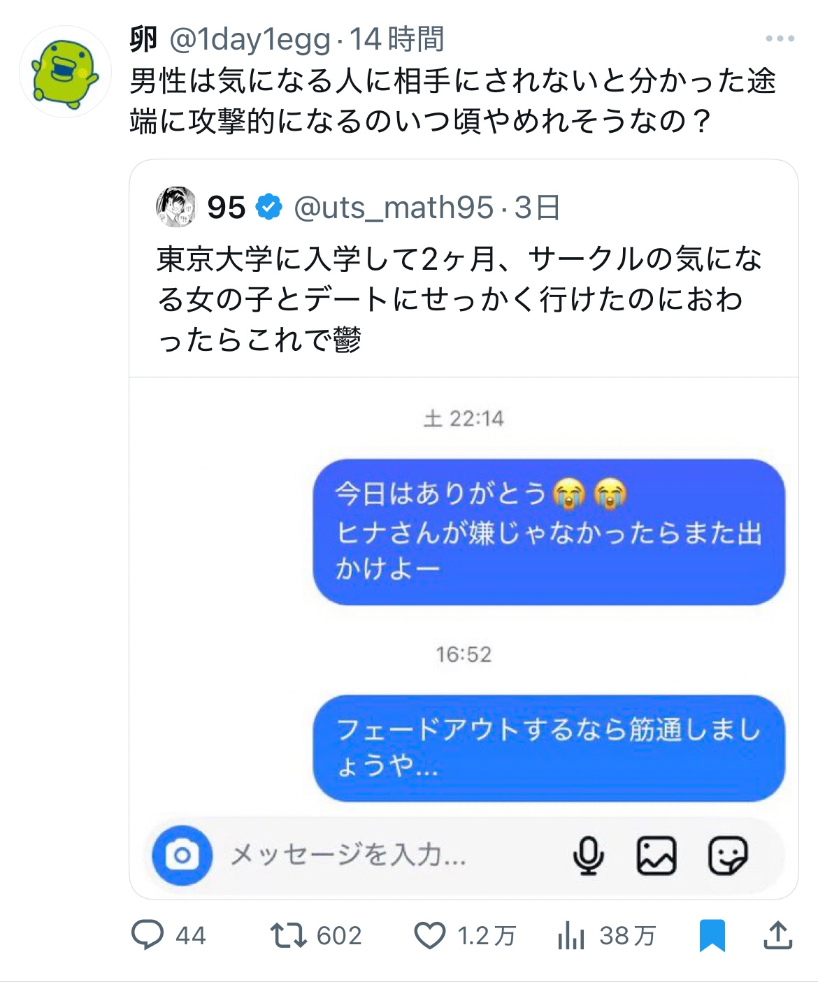 「デートたのちかったね」ってメッセージに返信なしシカト決め込まれてキレてるってこと?