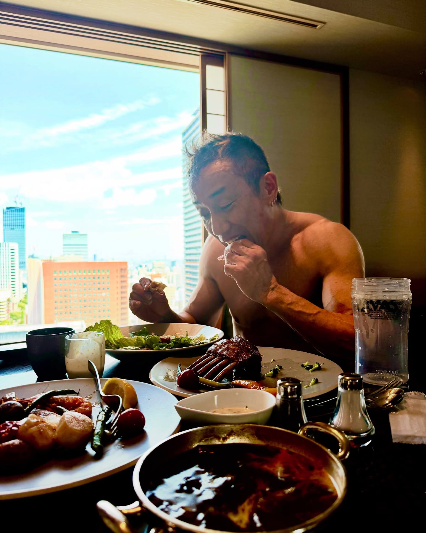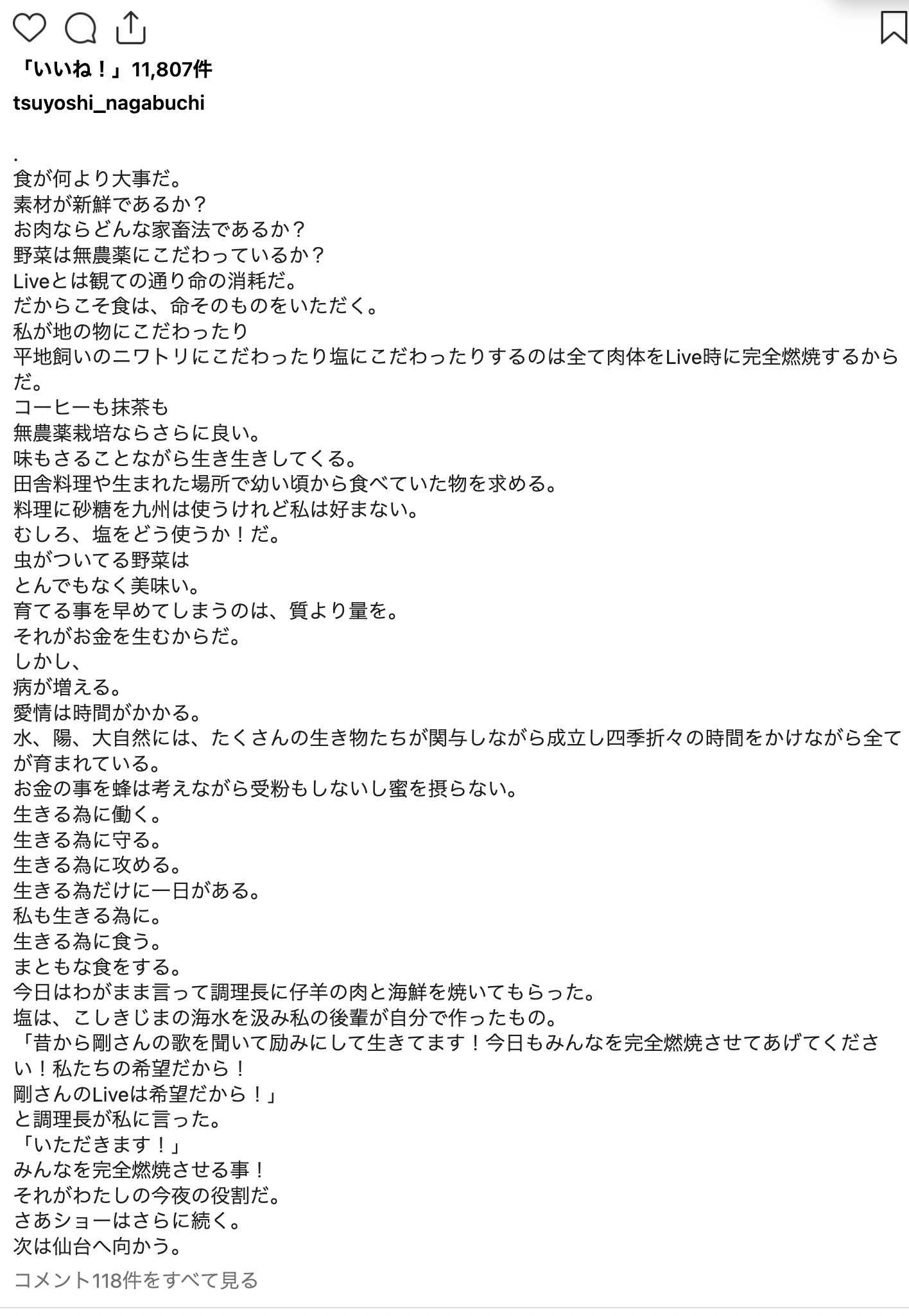 長渕さんは「食が何より大事だ。素材が新鮮であるか?お肉ならどんな家畜法であるか?野菜は無農薬にこだわっているか?Liveとは観ての通り命の消耗だ。だからこそ食は、命そのものをいただく」などとつづり、1枚の写真を投稿。食事中のソロショットです。服を着ておらず、鍛えられた肉体があらわになっています。また「食」への思いを長文でつづりました。