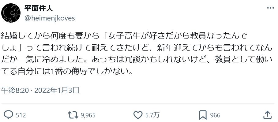 妻(18)「女子高生が好きだから教員になったの?」 夫「それは1番の侮辱だぞ!!」
