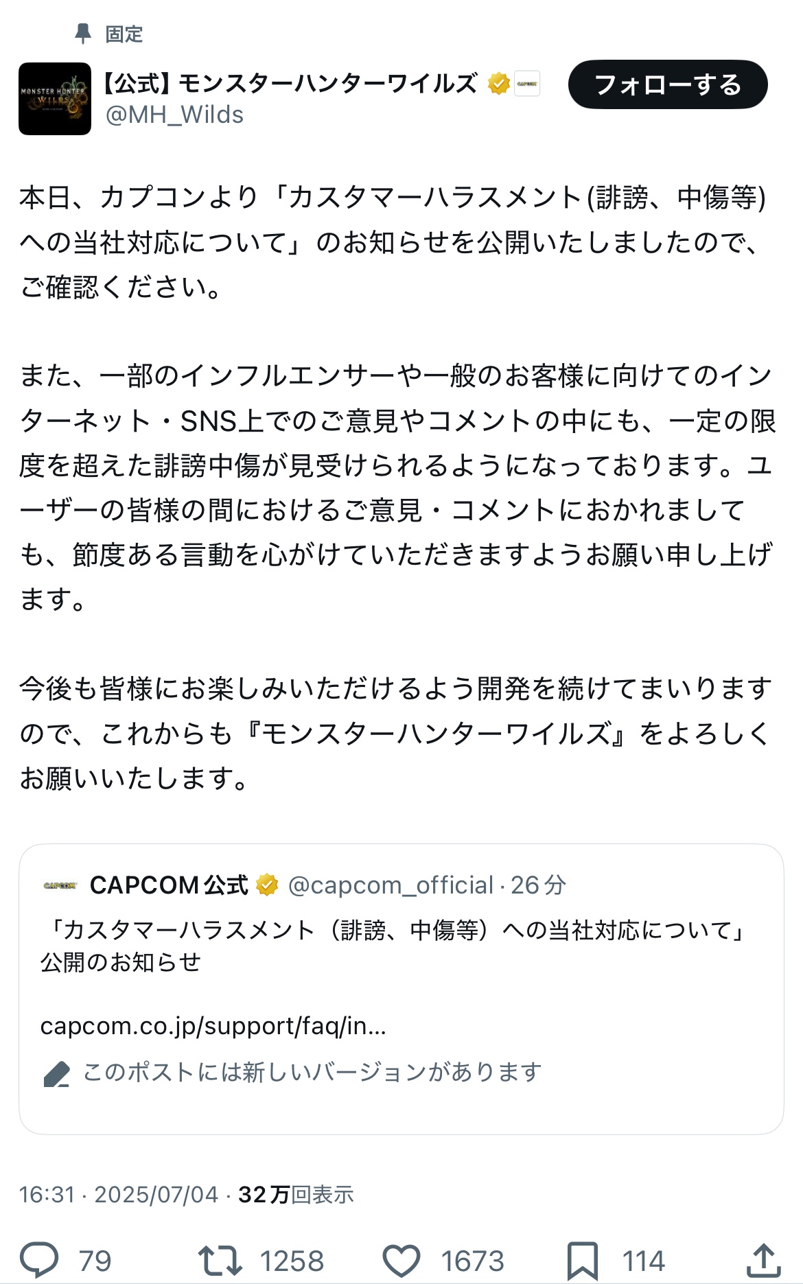 モンハンワイルズ公式、声明を発表「カスハラやインフルエンサーへの攻撃はお控えください」