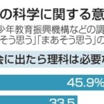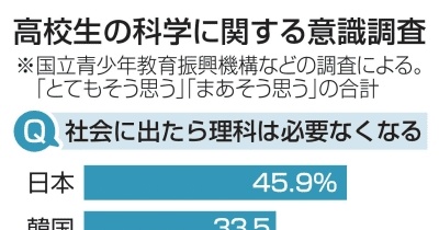 調査結果によると、「社会に出たら理科は必要なくなる」との問いに「とてもそう思う」「まあそう思う」と答えたのは日本が45.9%。韓国が33.5%、米国27.6%、中国17.6%だった。