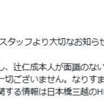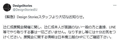 辻が主宰するWEBマガジン「デザインストーリーズ」の公式Xアカウントは、9~21日に日本橋三越本店で開催される「辻仁成展 Le Visiteur TOKYO」に関して「《緊急Design Storiesスタッフより大切なお知らせ」とし、「辻仁成展覧会開催に関し、辻仁成本人が面識のない一般の方と直接、LINE等でやり取りする事は一切ございません。なりすまし等には十分お気をつけください。展覧会に関する情報は日本橋三越のHPにてご確認下さい」と注意を呼びかけた。