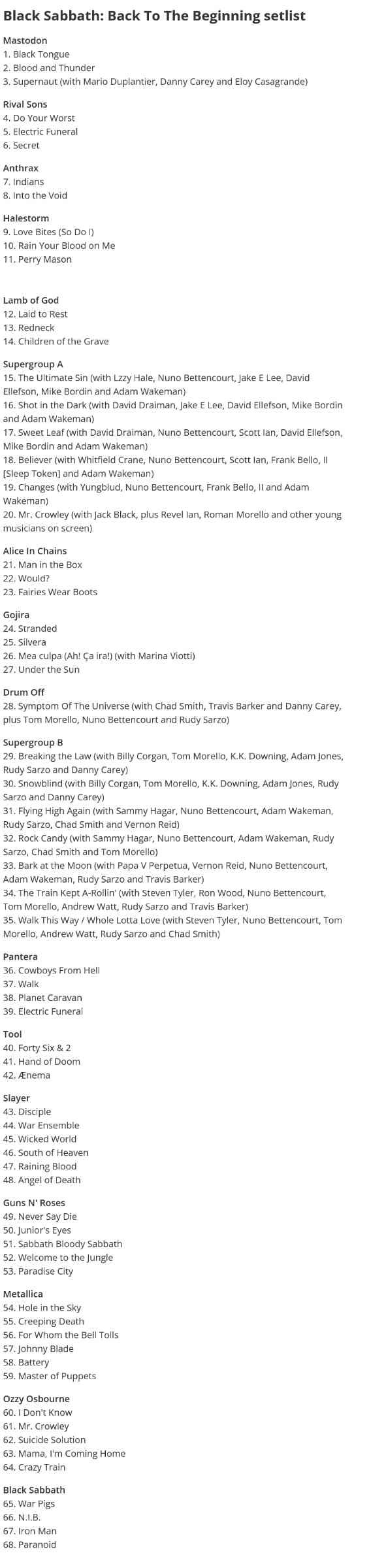 ブラック・サバス ラストライヴで4曲披露 オジーはソロでも5曲披露 メタリカやガンズら豪華バンドがカヴァー演奏 スーパーグループにはサプライズも