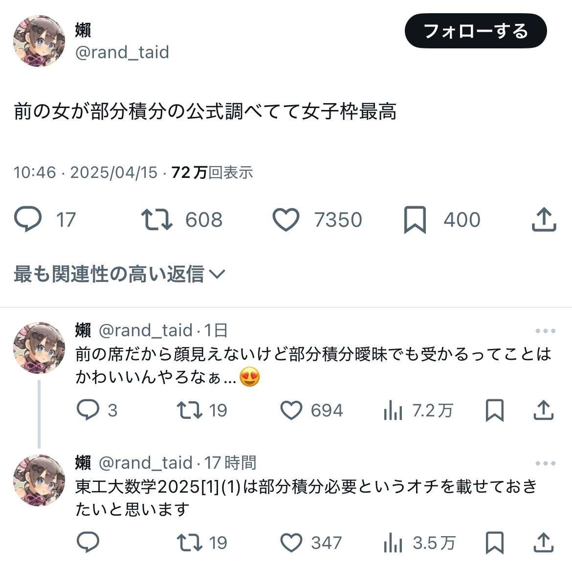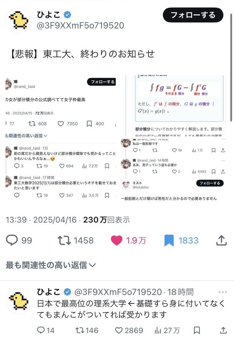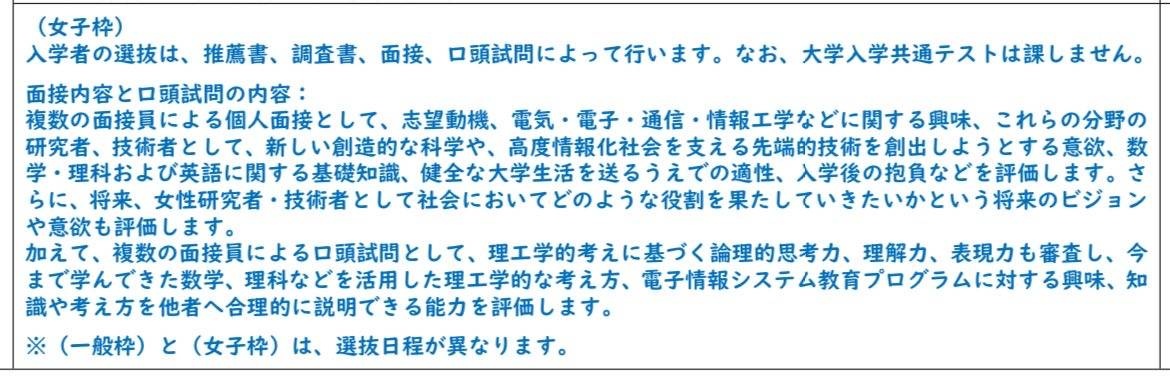 東工大の女子枠の平均倍率約1.4倍(一般選抜の平均約3.5倍)、情報理工にいたっては定員割れで女子枠の受験者全員が合格してて笑った。
