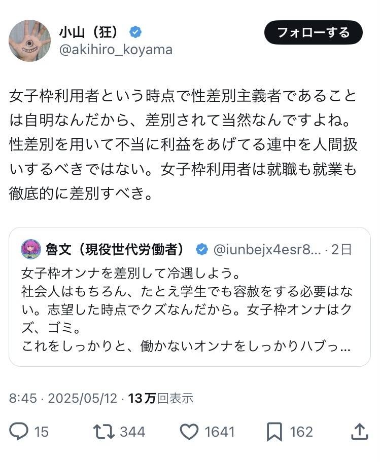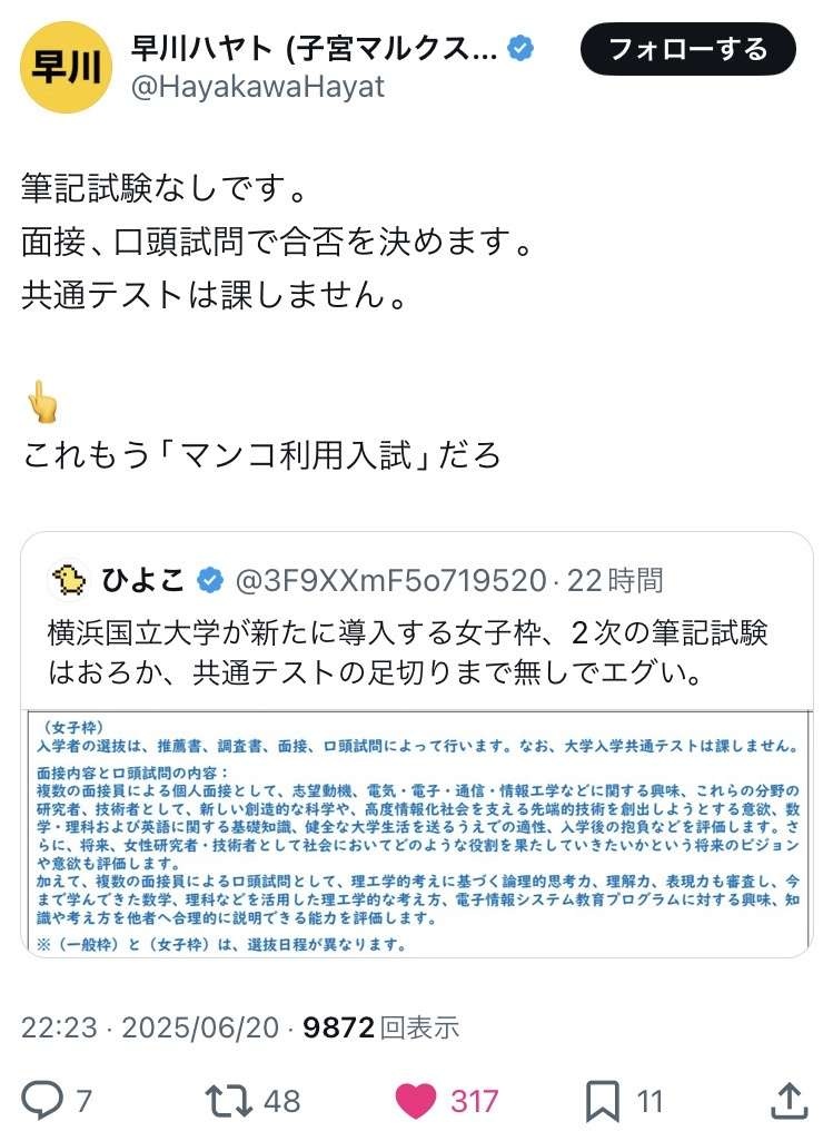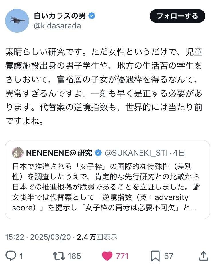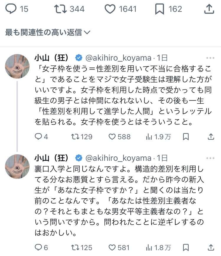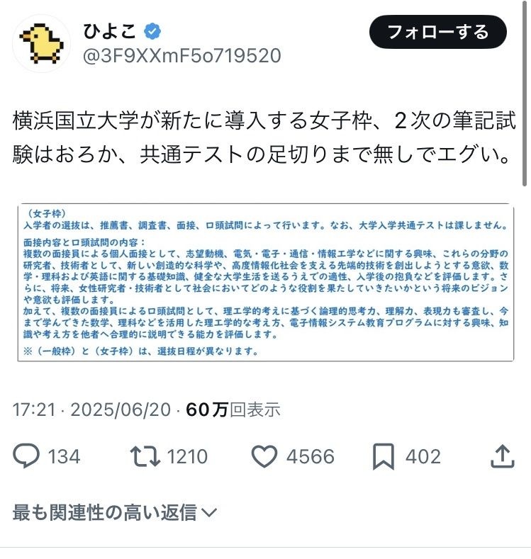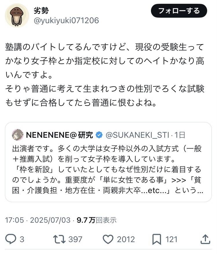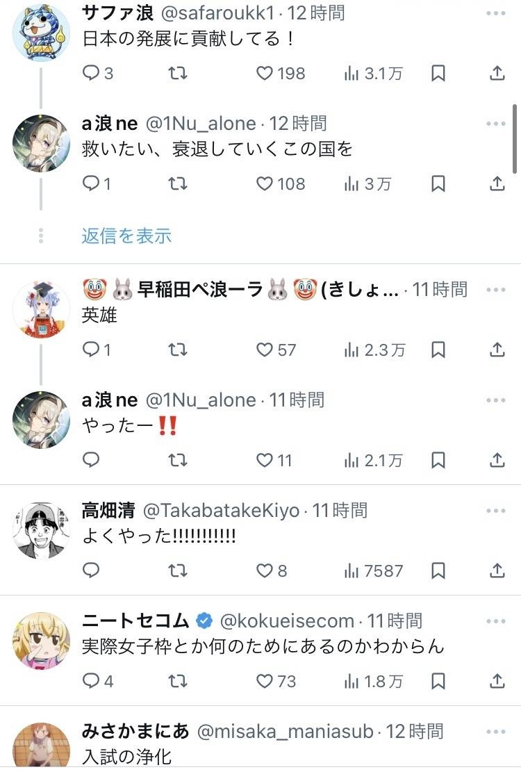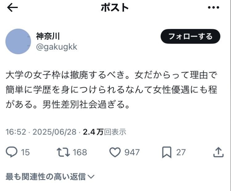 【画像】大学入試の女子枠、若い男性からメチャクチャ憎悪されていた…
