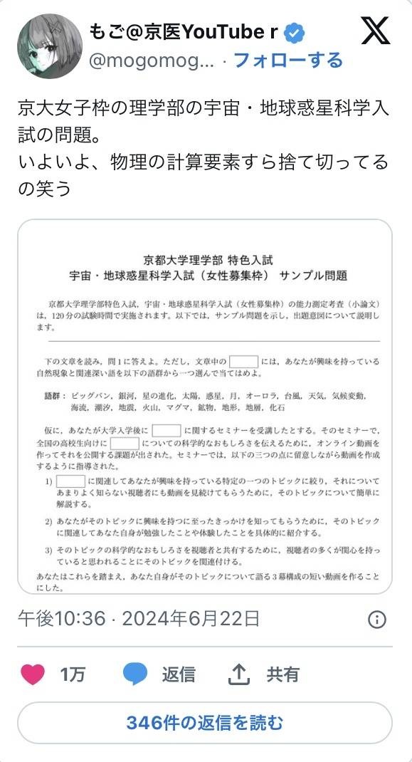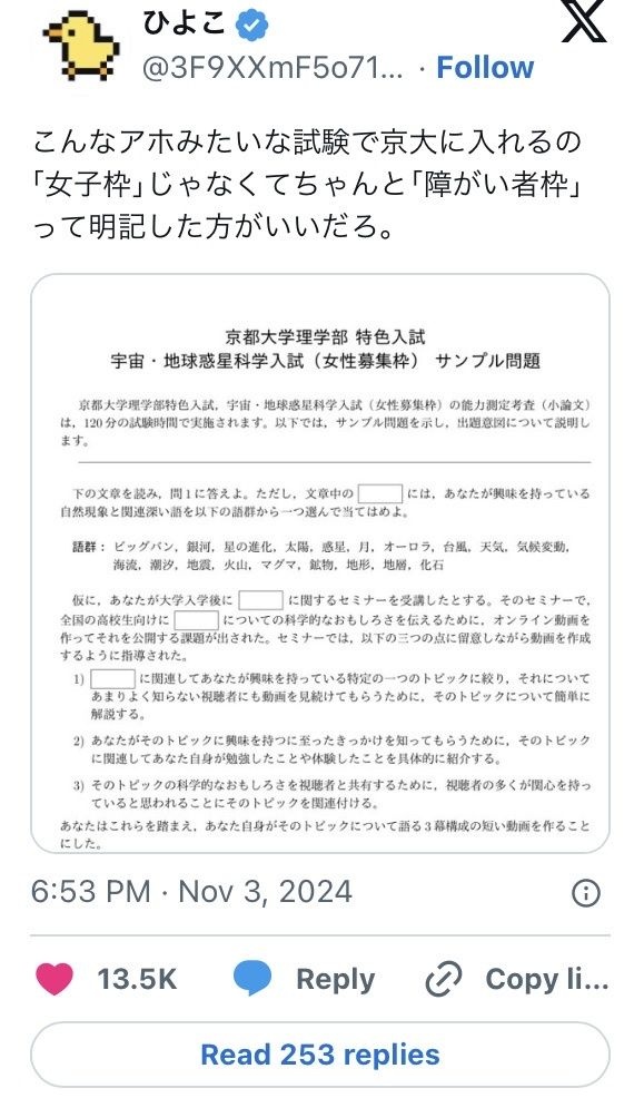 その上で、女性入学者全体の半分以上が女子枠合格者で完全にバカを入れる為のシステムになっていて終わり過ぎてる。