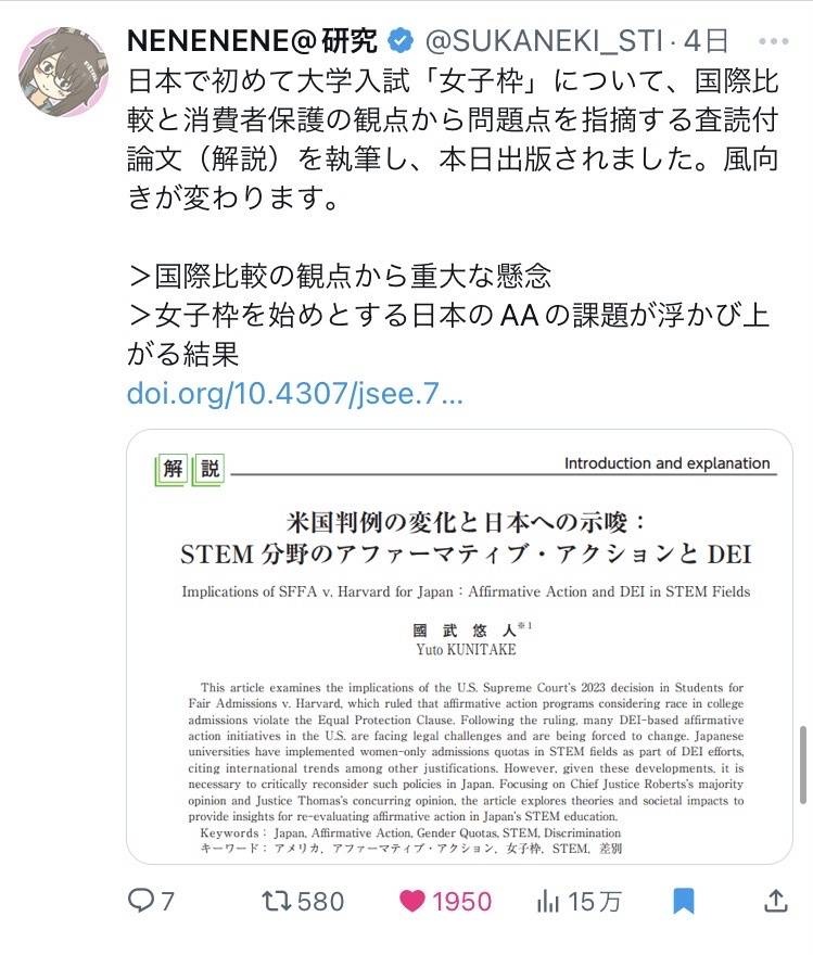 女子枠の差別性・違法性を指摘する査読付き論文も出版された模様